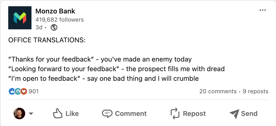 Brands like Monzo Bank and HubSpot understand this deeply. They create content that stands out in organic feeds without coming across as stuffy B2B/Legal content.