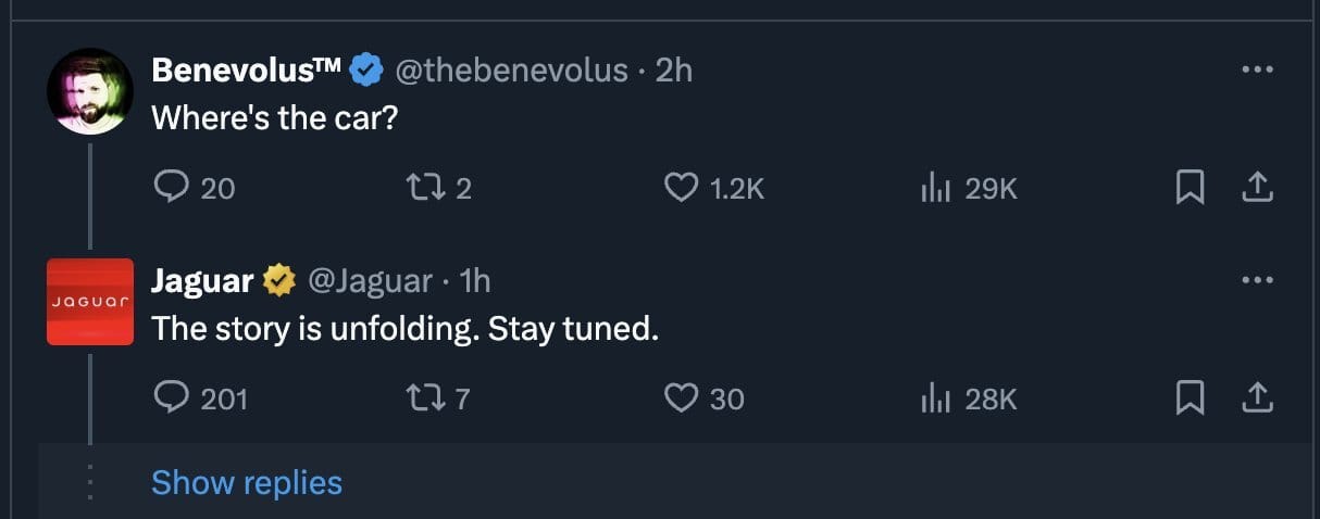 Imagine if Jaguar had released their full car concept within 48 hours of the teaser. They could’ve sustained the momentum, owned the conversation, and cemented their rebrand in pop culture. Instead, they missed their trend window, and the story of their cars got buried.